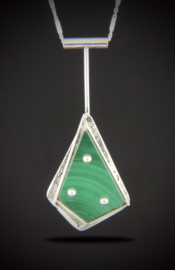 The necklace showcases a polished piece of deep green malachite cut into a bold, diamond-like shape. The stone is celebrated for its distinctive, swirling bands of color.