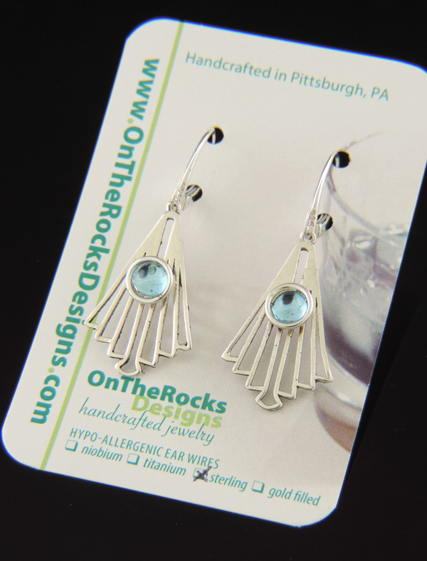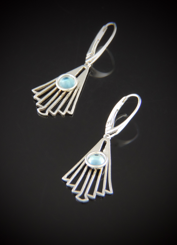 Sophisticated elegance with an Art Deco flair. These earrings feature geometric sterling silver fan links accented by vibrant 5mm Swiss Blue Topaz cabochons set in fine silver. Secure sterling silver lever backs ensure comfortable, all-day wear.