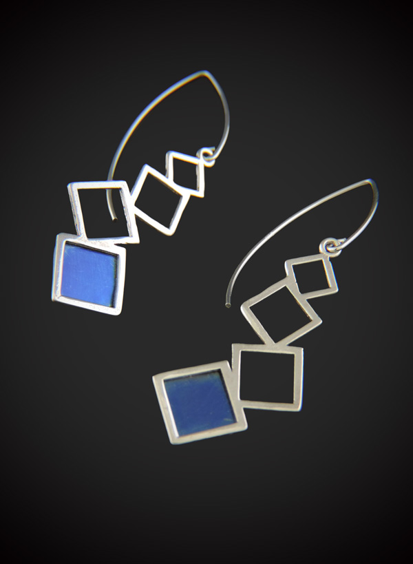 Elevate your jewelry collection with a touch of modern geometry and a splash of vibrant color. The Blue Delight earrings feature a sophisticated architectural design, meticulously handcrafted with interlocking sterling silver cube links. At the base of each dangle sits a striking 3/8″ blue titanium accent, providing a bold contrast against the polished silver. Finished with elegant, v-shaped sterling silver earwires, these earrings offer a lightweight feel with a high-impact aesthetic.