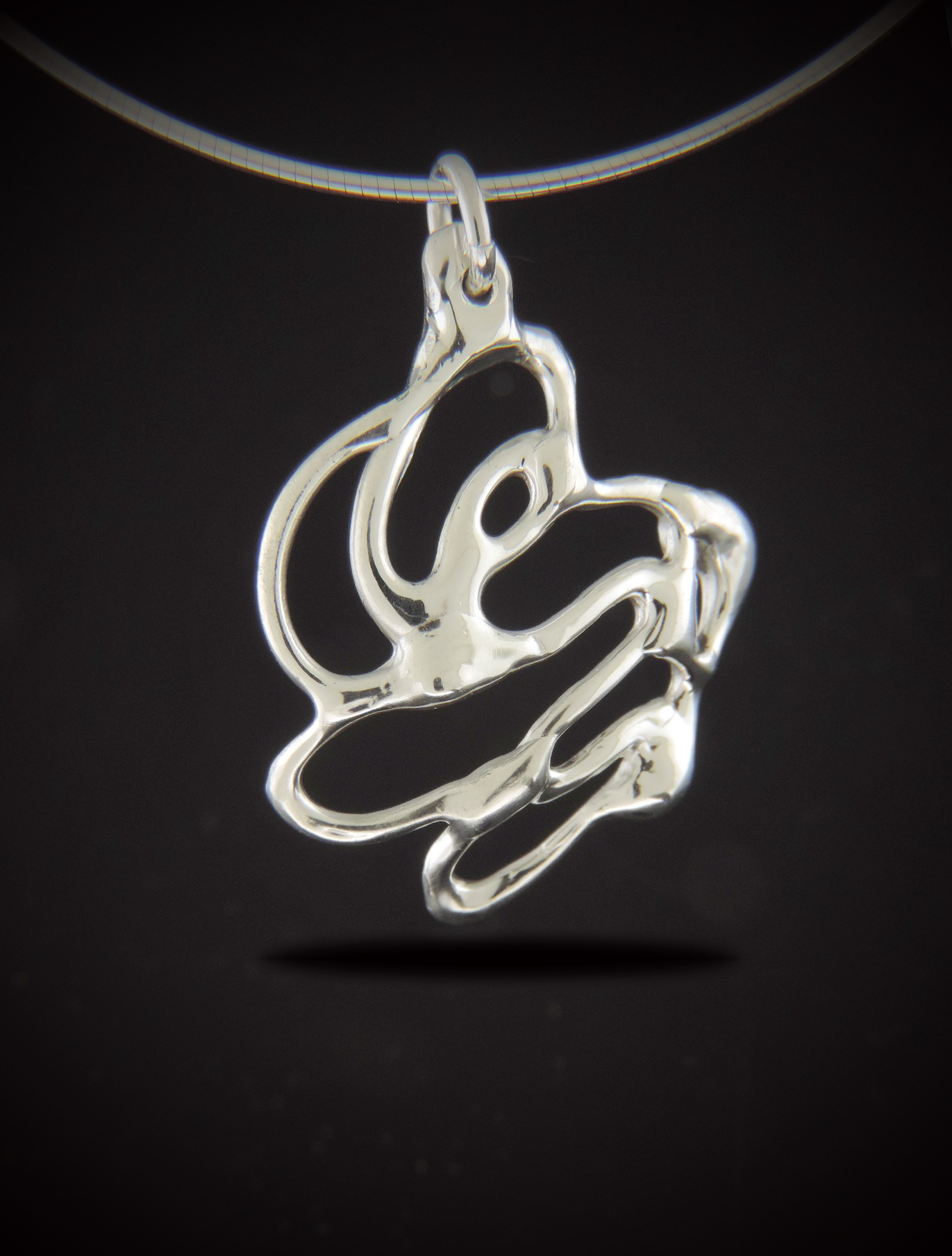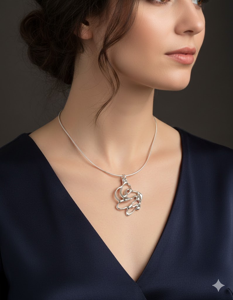 Adorn yourself with this captivating sterling silver pendant, a true conversation starter. Its artistic, abstract design hangs gracefully on a 16 to 18-inch omega chain, making it the perfect statement piece for any occasion.