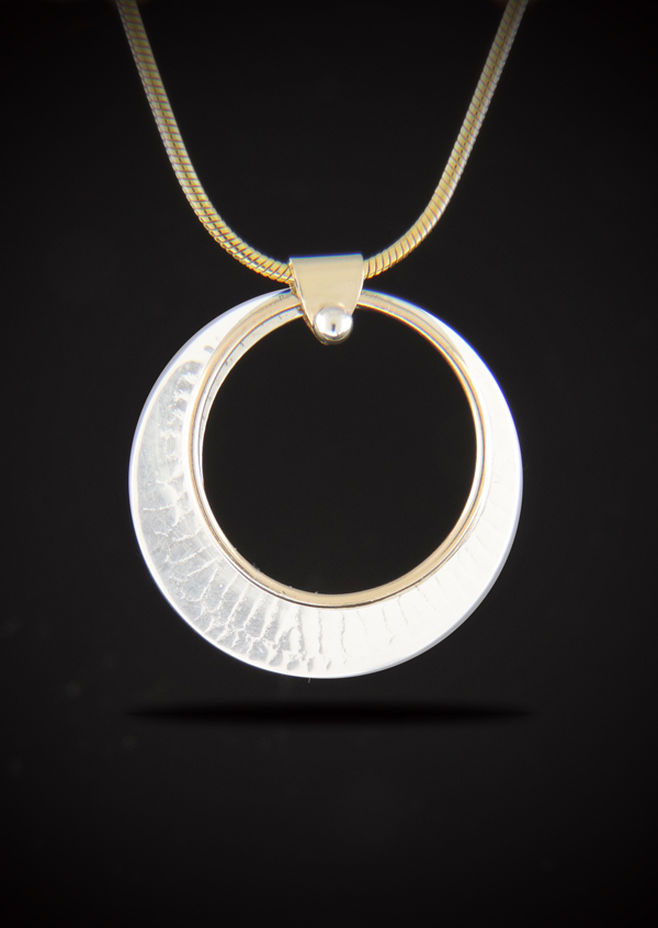 • Pendant: 1″ Sterling silver open disk with custom roll-printed texture.