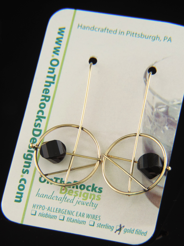 Crafted from luminous gold-filled wire, the design features a sleek circular frame intersected by sharp, dynamic lines, creating an eye-catching, abstract pattern. At the heart of each composition rests a faceted, spiral-cut black onyx bead, which provides a rich, grounding contrast to the bright metalwork.