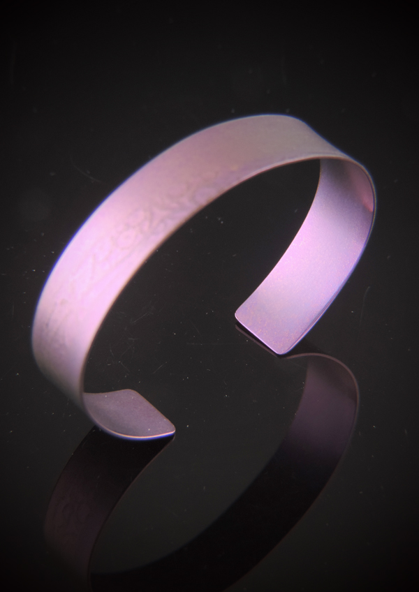 Crisp and contemporary, this 1/2″ wide pink titanium cuff bracelet showcases a clean, sculptural silhouette with subtle surface detail. The softly curved band features a textured print that adds depth and visual interest, while the anodized pink finish catches the light with a smooth, luminous glow.
