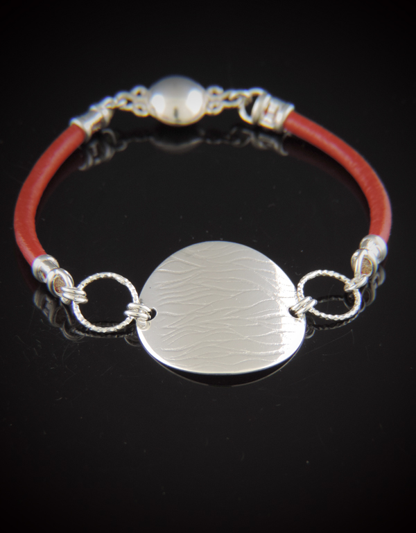 Sleek and refined, this handcrafted bracelet pairs rich red leather with cool sterling silver for a clean, modern statement. A softly textured 1″ sterling silver disk anchors the design, adding subtle surface detail and a contemporary focal point. The bracelet is finished with a secure sterling silver magnetic clasp for effortless wear and a polished look.