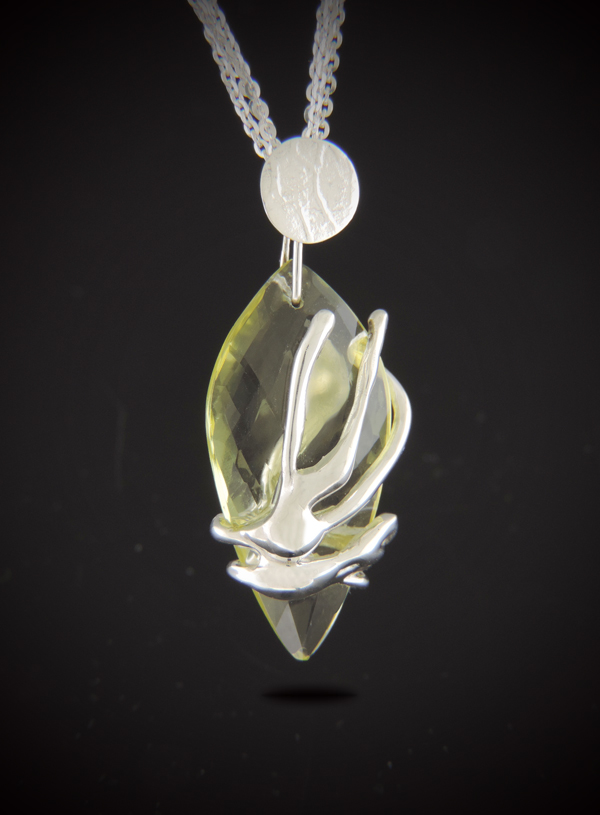 The centerpiece features a stunning faceted lemon quartz, precision-cut into an elegant upside-down teardrop (marquise-style) shape. To add a modern, artistic edge, the stone is cradled by a custom-cast sterling silver “splash” that wraps around the base, mimicking the fluid motion of water.