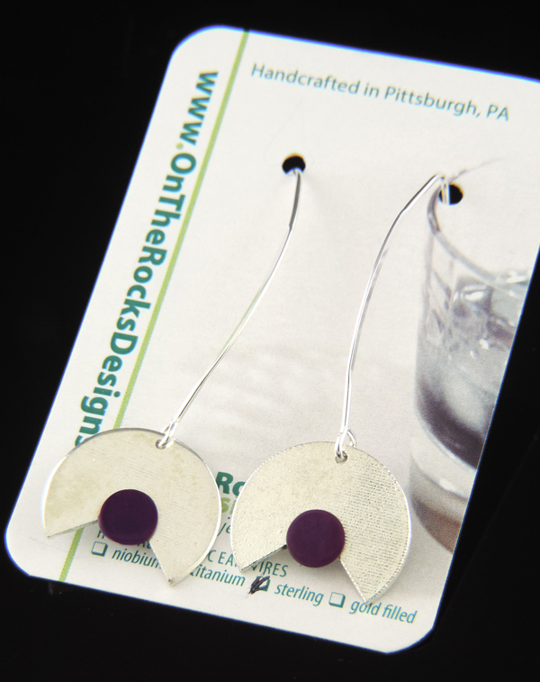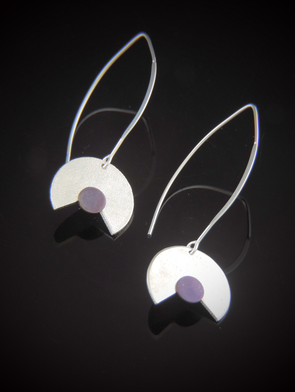 Playful geometry meets modern elegance in these striking statement earrings. Featuring a Pac-Man–shaped sterling silver disk paired with a vibrant purple titanium accent, the design balances clean lines with a pop of unexpected color. The brushed silver surface adds subtle texture, while the titanium disc brings a rich, luminous contrast.